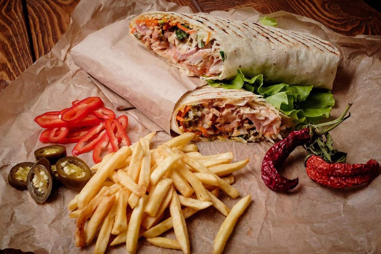 Лаваш, куряче м'ясо, сир, фрі, капуста, помідор, цибуля червона, соус кефірний