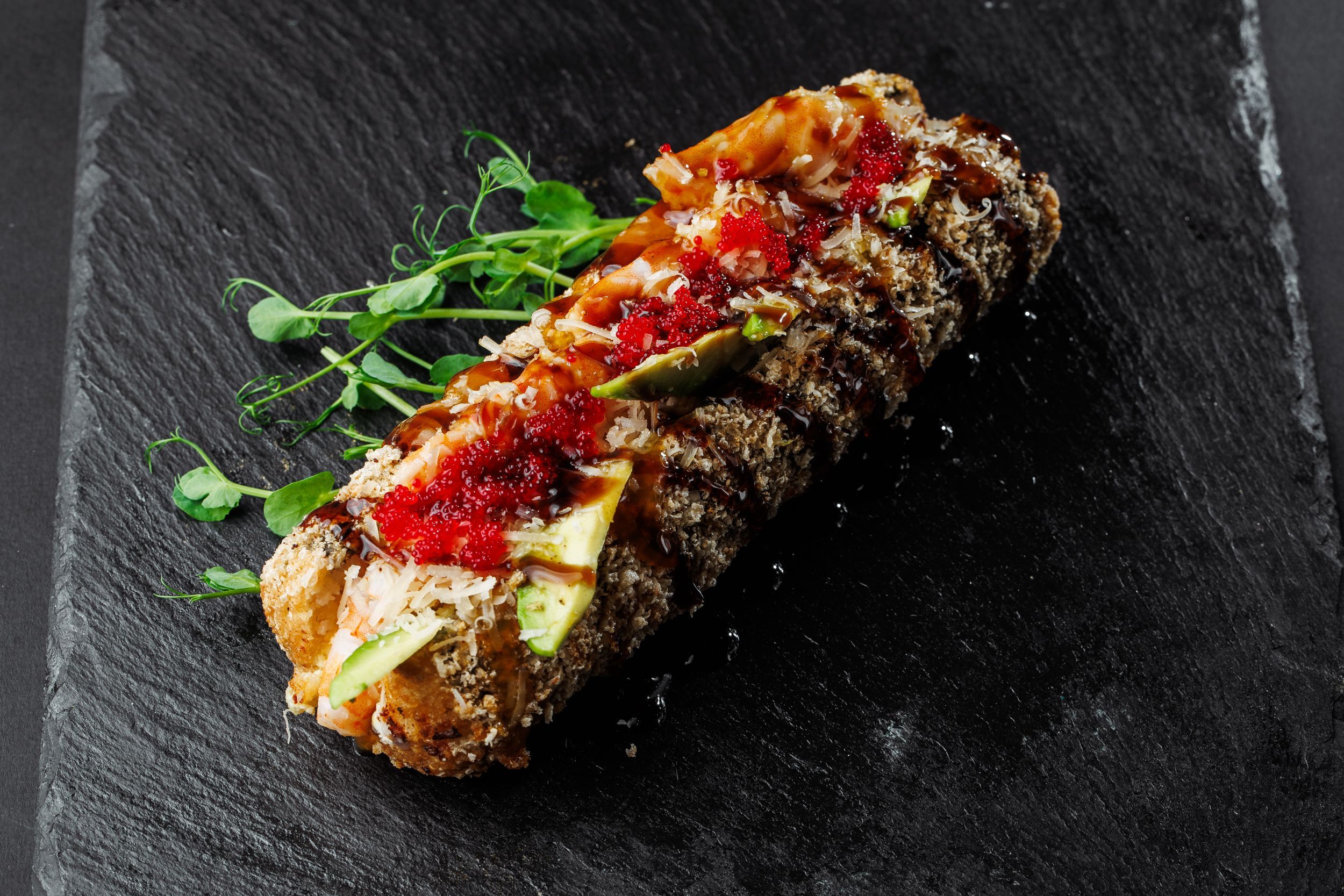 Креветка, сир філадельфія, соус унагі, соус спайсі, соус кисло- солодкий, авокадо, ікра тобіко, пармезан. Рол підсмажений в темпурі