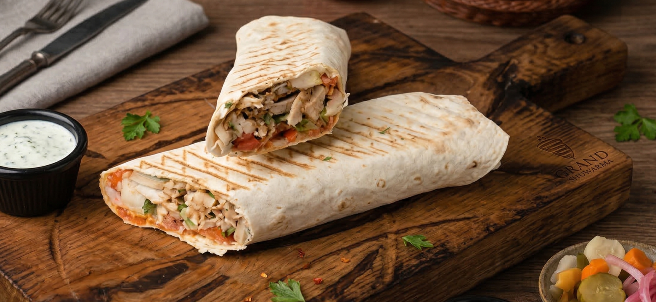 Лаваш,курочка,соус часниковий, помідор свіжий, капуста свіжа,огірок маринований, морква по-корейськи, сир моцарела,