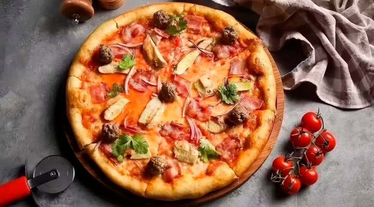 Соус із томатів, салямі, шинка, мисливські ковбаски, бекон, копчене куряче філе, сир моцарела, шампіньйони, маринована цибуля, болгарський перець, помідори, маслини, орегано