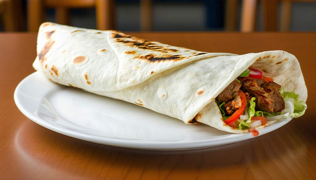 Лаваш, запечене куряче мʼясо, салат з капусти, огірок, помідор, цибуля маринована, соус