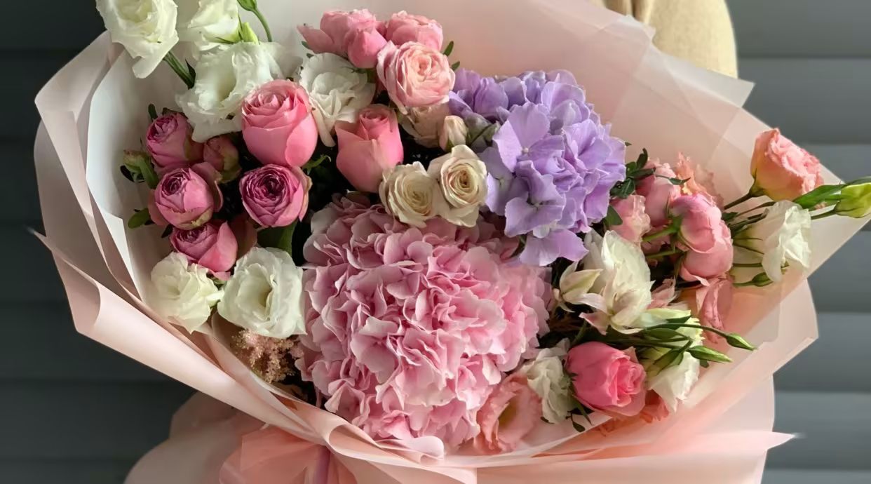 Букет квітів з піоновидних троянд та гортензій