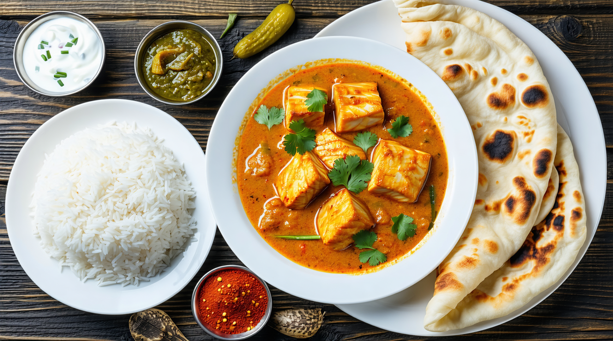 A rich, flavorful fish curry served with steamed rice and warm naan bread