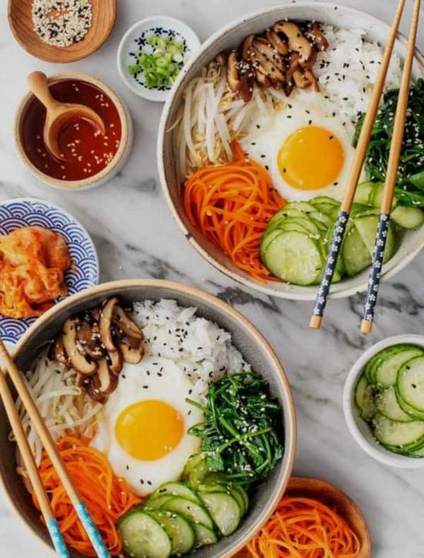 Сварени зеленчуци, паста от червена соя, ориз, яйце