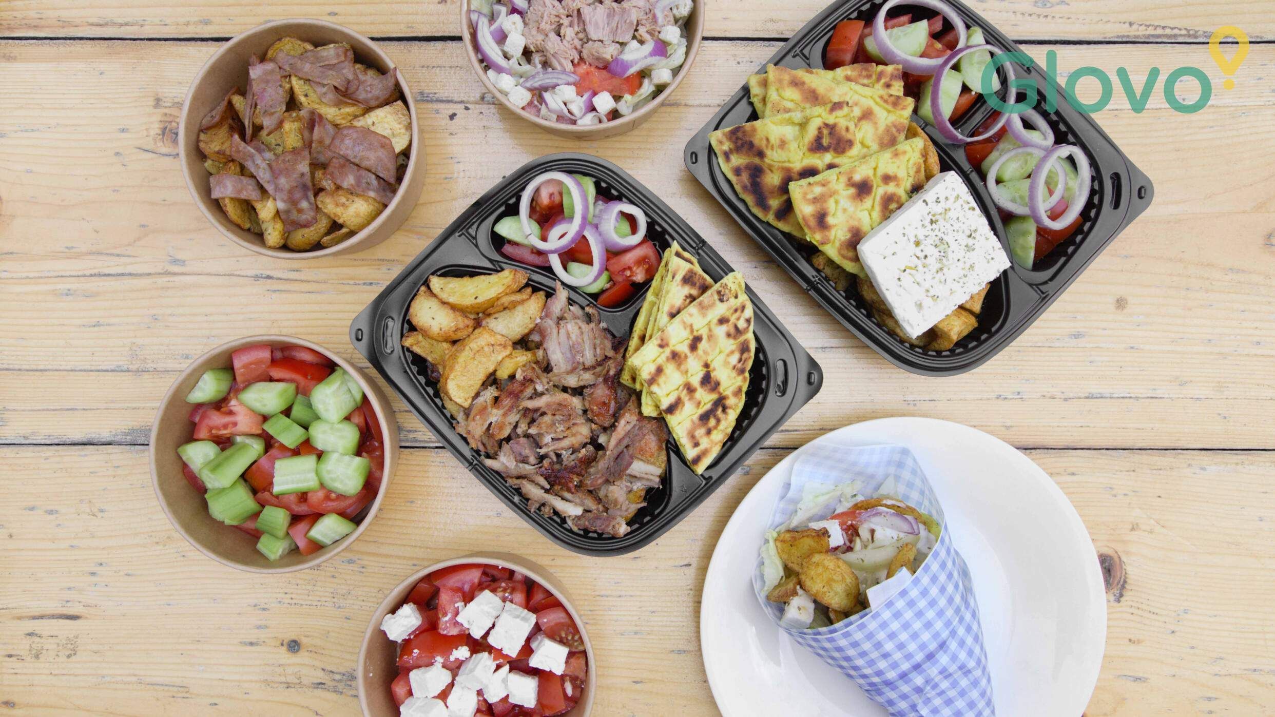 Целият грамаж се получава при пълен избор от зеленчуци, сосове и картофи. Домат, лук, фета сирене, картофки, гръцка пита, дзадзики. Прясно избелени картофки не бланширани. Без консерванти, стабилизатори, адитиви, натриев глутамат и Е-та - 750г