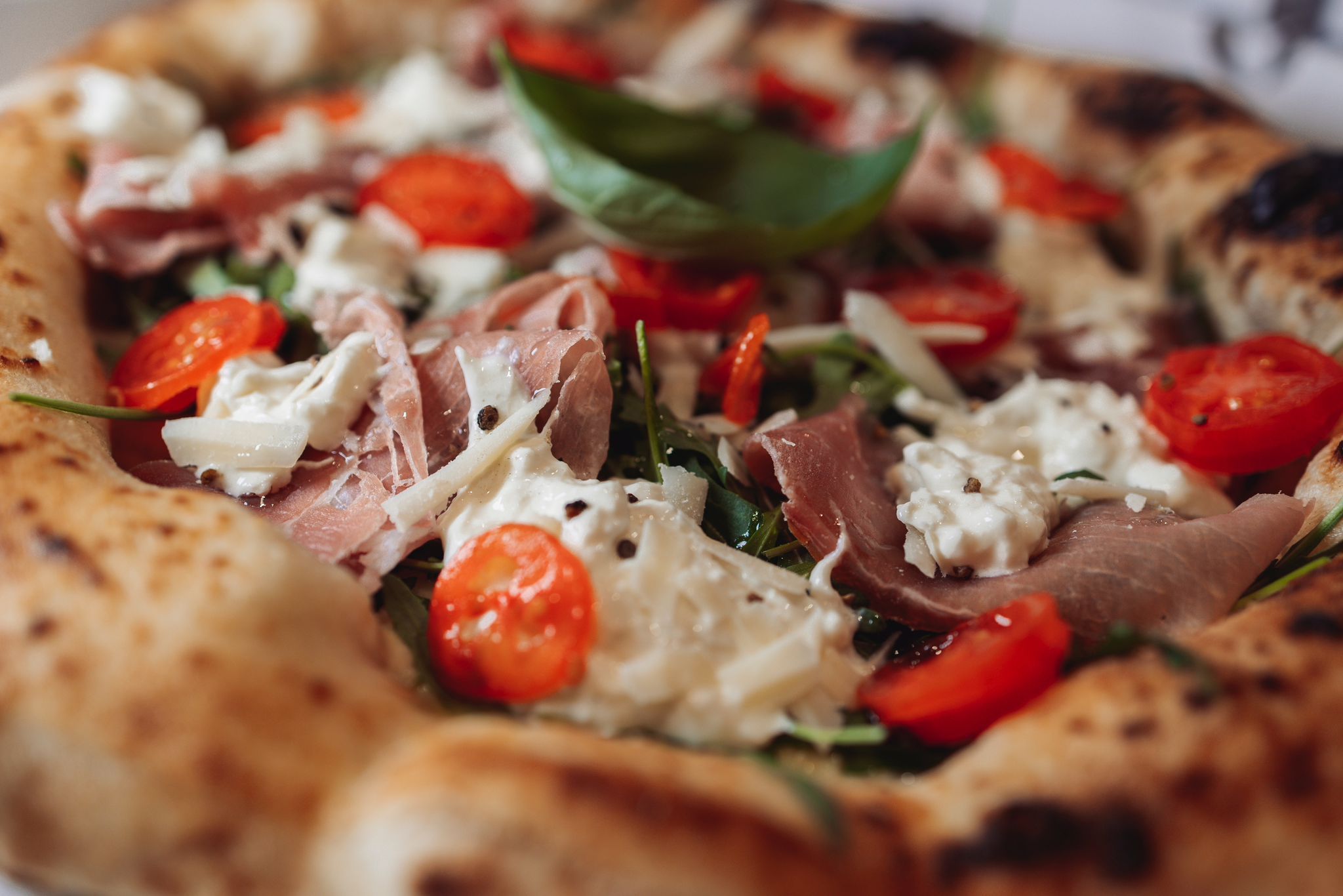 Mozzarella FDL, tomate cherry, rúcula, jamón de parma y parmesano,straciatella de burrata.