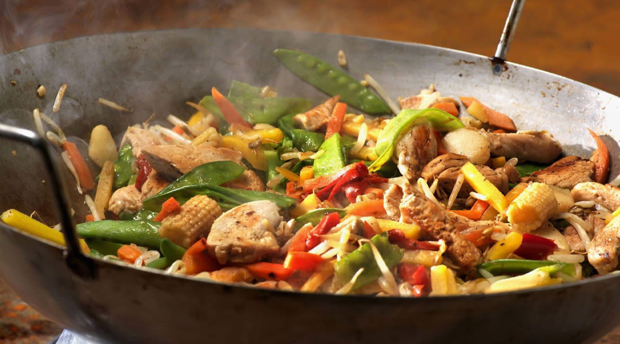 Pollo con verduras variadas , cacahuetes y salsa picante