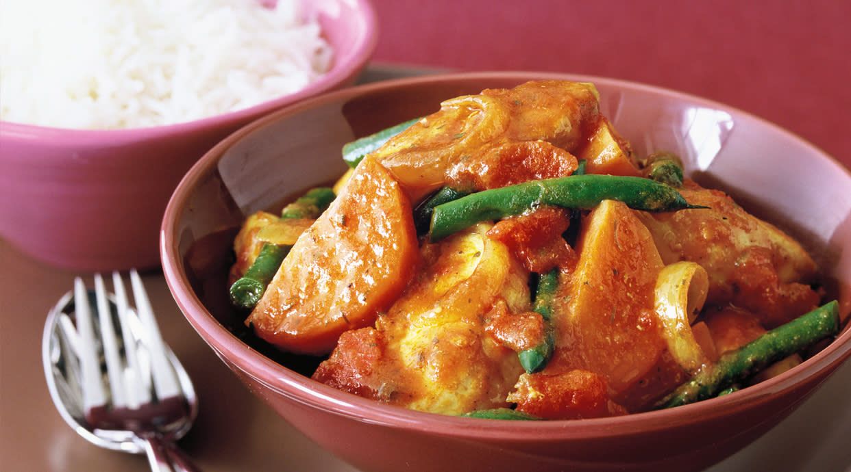 Pescado con arroz basmati servido con salsa curry picante o suave
