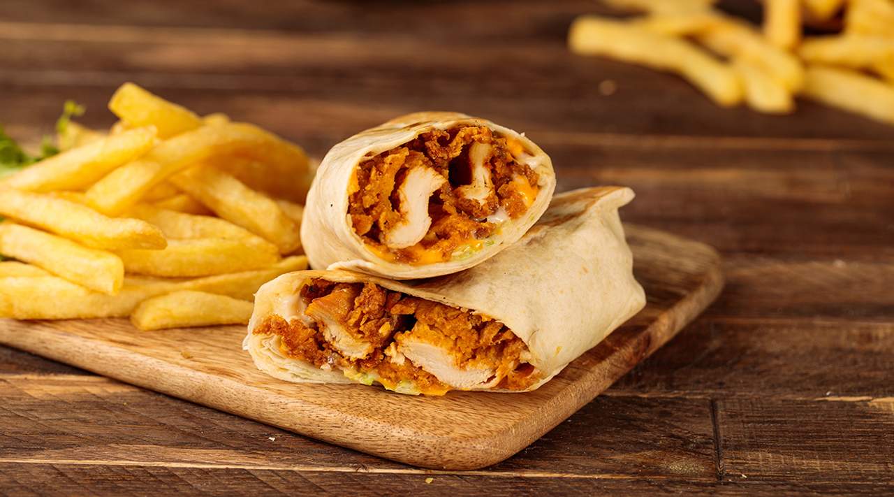 Rollo de fina masa de pan, con carne de ternera o pollo, lechuga, tomate, cebolla, lombarda, berza y salsas