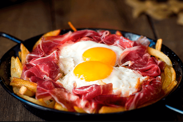 montadito de pan de pimenton con presa plancha huevo de codorniz y jamon
