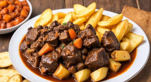 Plato de fabada Asturiana con judías blancas, zanahoria, patatas, chorizo, morcilla y panceta.