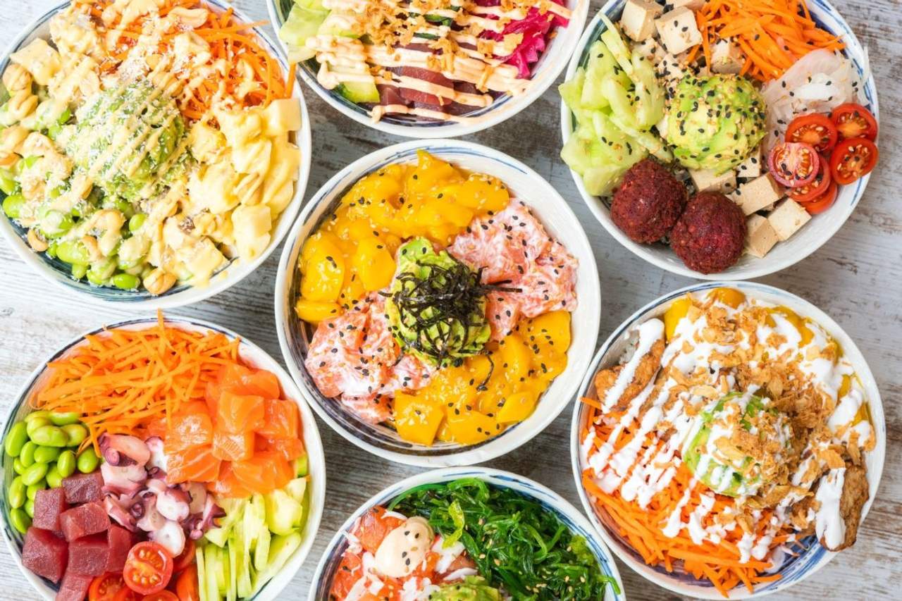 Elige una base, dos proteínas, cuatro toppings, hasta dos salsas, un complemento y todos los extras que quieras