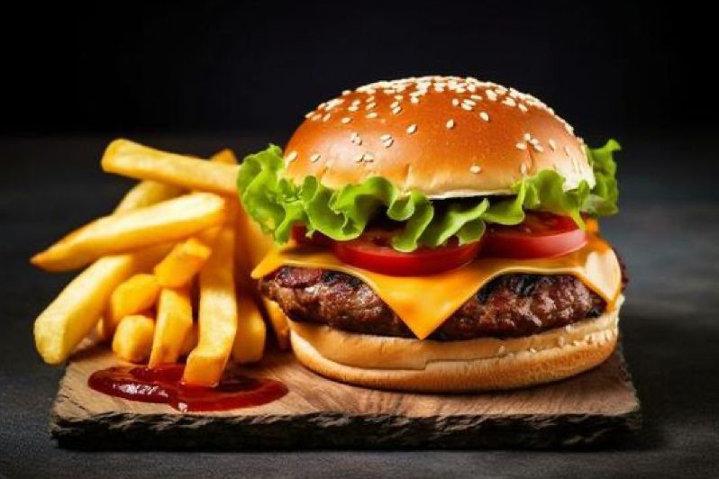 Carne de txuleta con salsa barbacoa, mayonesa, lechuga, queso, bacon, huevo frito, pan rústico y patatas fritas.