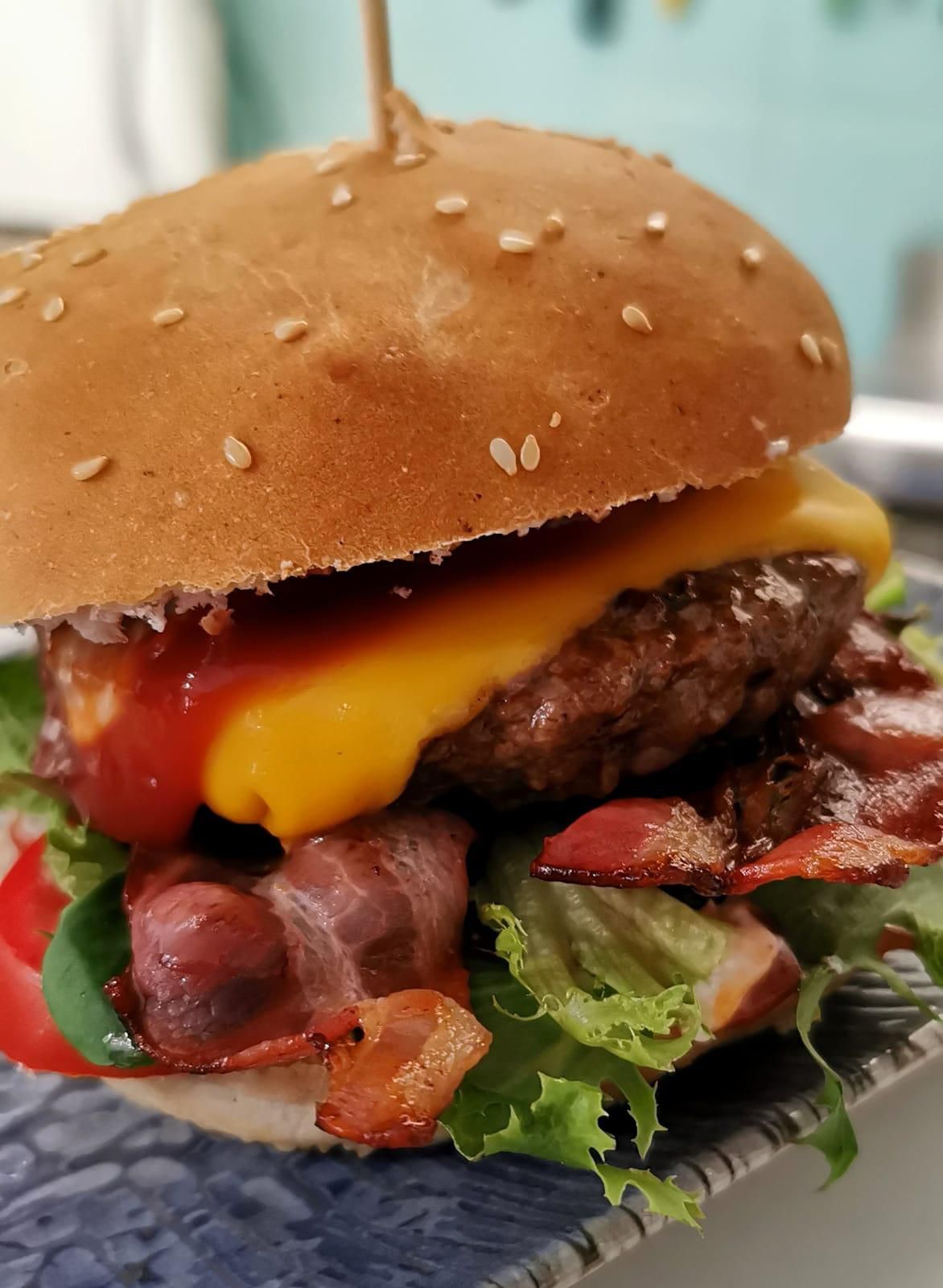 Nuestro pollo desmenuzado, cebolla asada, queso gouda, huevo frito, bacon, cebolla crujiente y queso americano