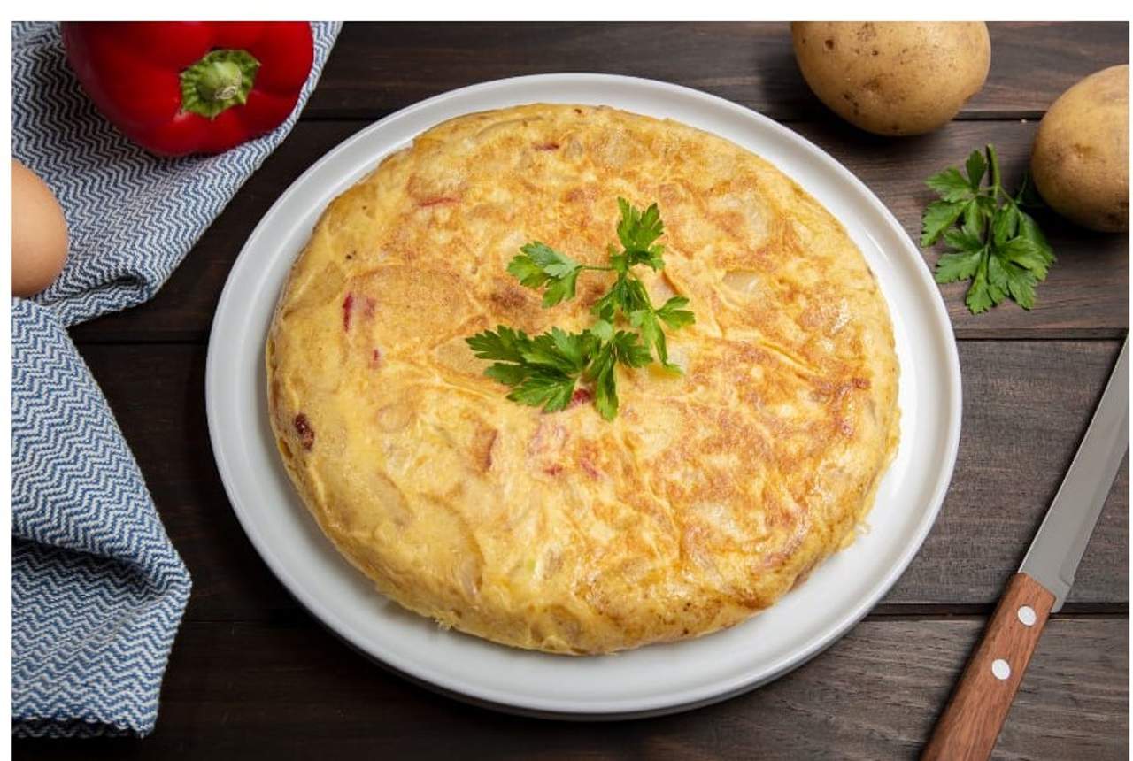 Tortilla jugosa de patata cebolla. queso manchego y jamon dulce