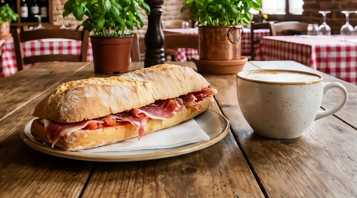 Bocadillo con tomate, aceite, queso curado y jamón dulce.