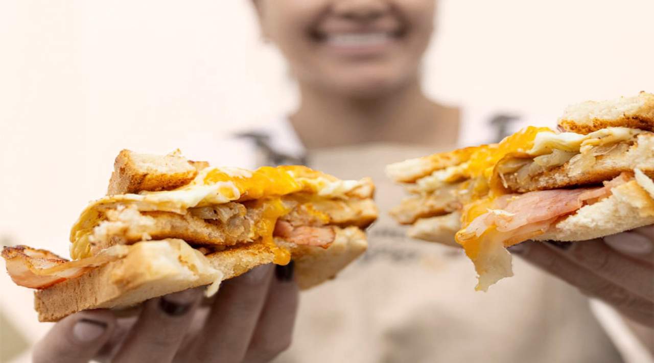Sándwich Especial. Bacon, Huevo, Queso Semicurado y Cebolla Pochada