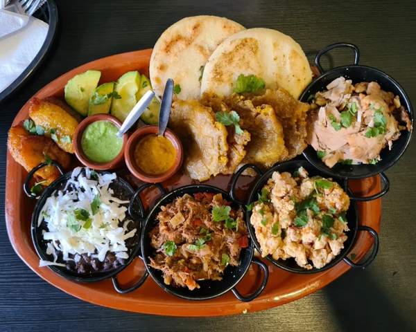 Judías negras, queso llanero, carne mechada y tajadas de plátano