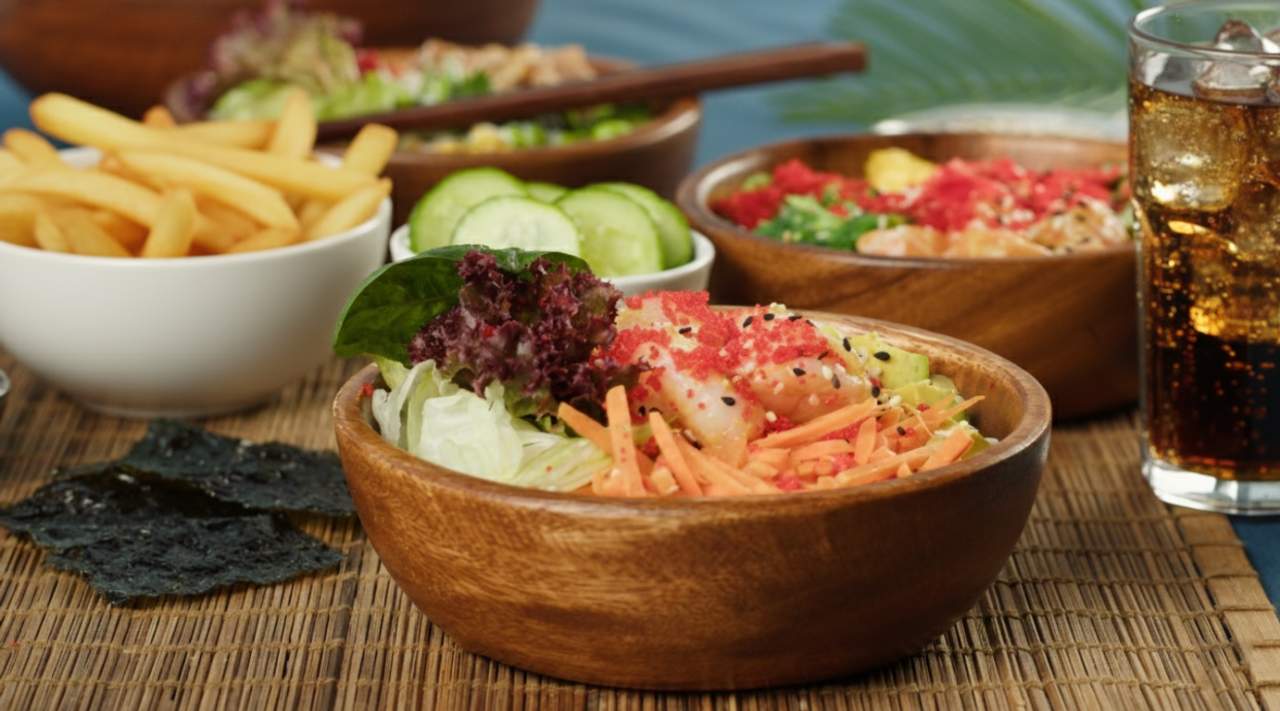 Arroz, aguacate, pepino, mango, alga wakame, cherries, chia y spaicy sauce