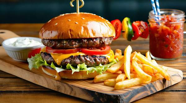 Lechuga, tomate, doble queso cheddar, acompañada de patatas fritas