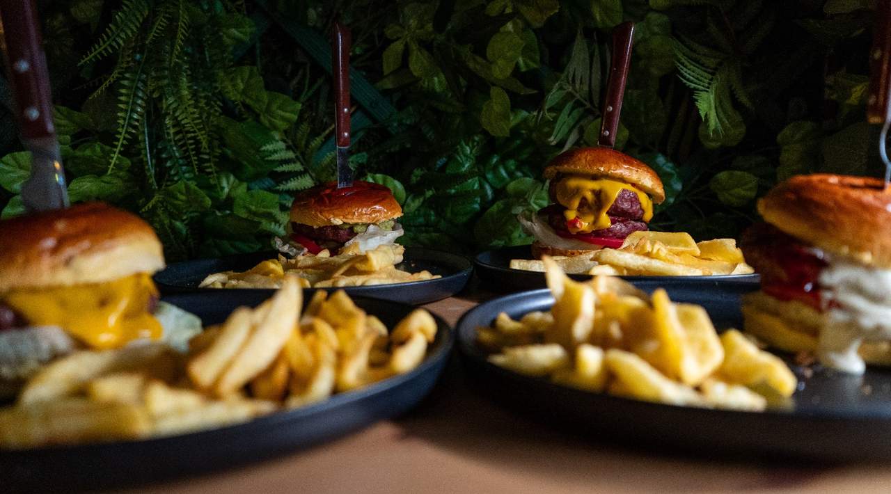 Carne vegana, pan vegano, tomate, lechuga, guacamole y cebolla morada