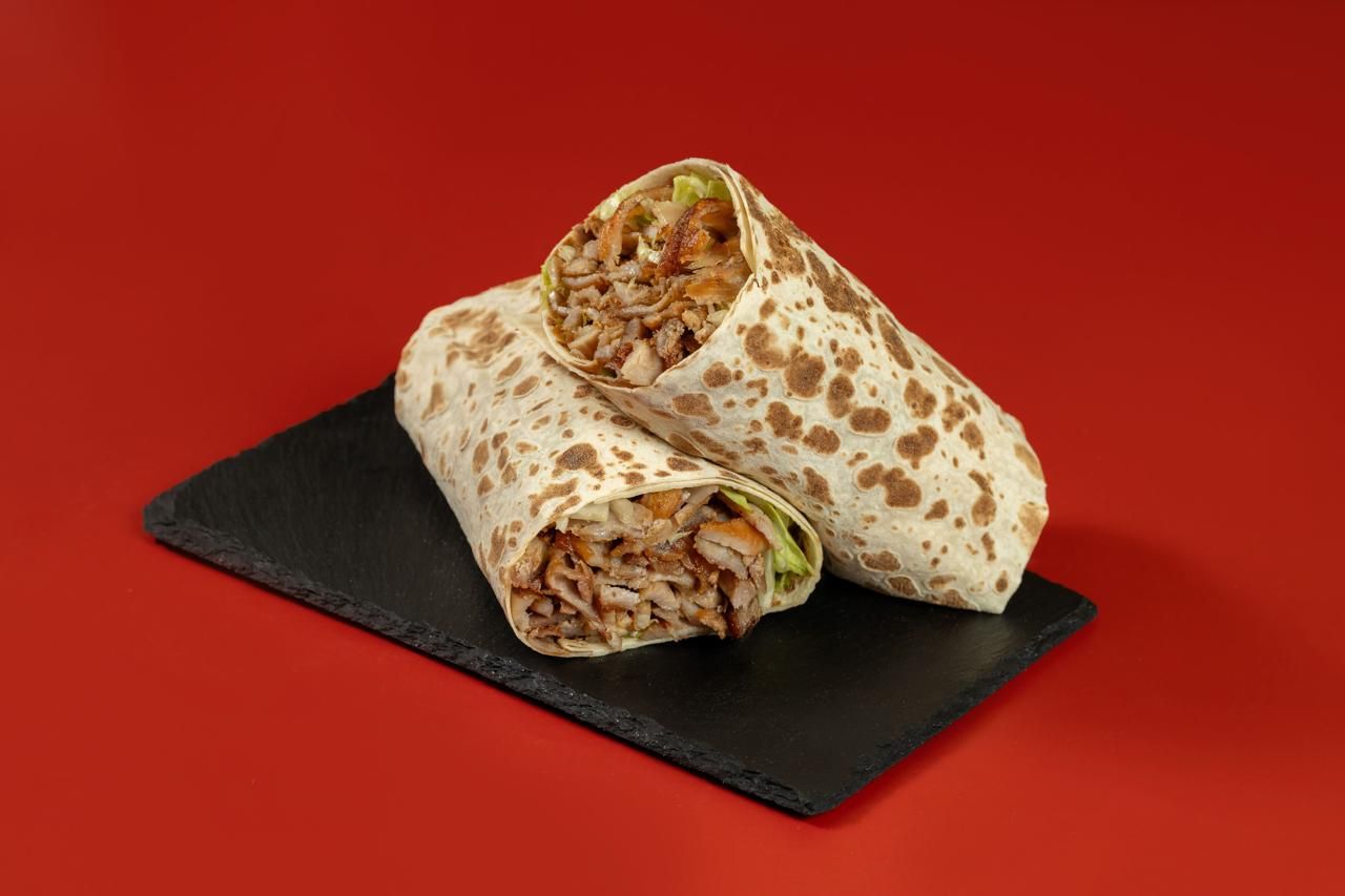ღორის ხორცი, სალათის ფოთოლი, ხახვი, წიწაკა, კეჩუპი, მაიონეზი, პომიდორი