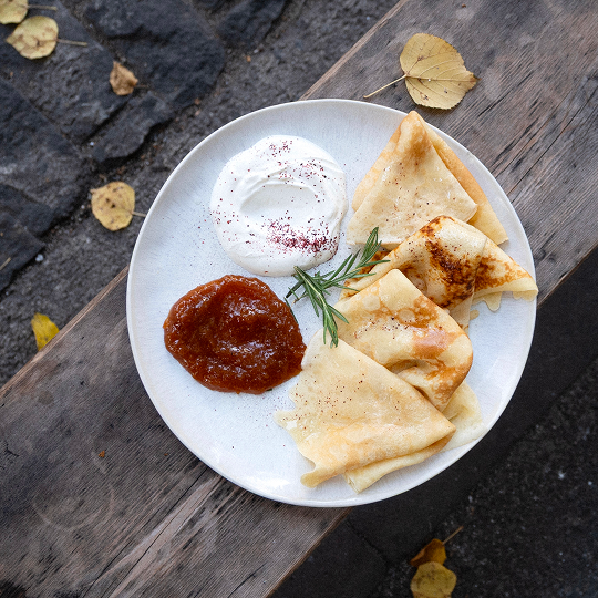 არაჟნით, ატმის ჯემით და სეზონური ხილით
