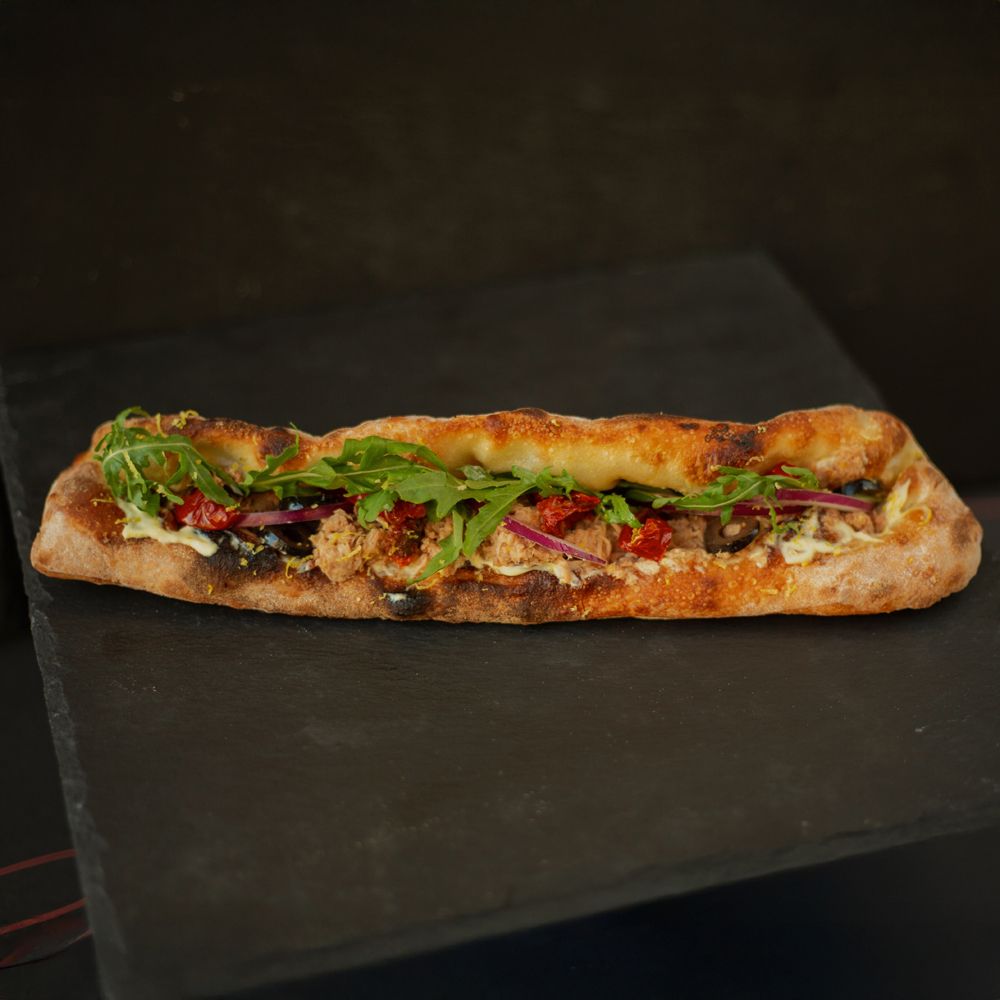 ახლად გამომცხვარი პური, თინუსი დაკონსერვებული, წითელი ხახვი, რუკოლა, პომიდორი, ზეთისხილი, ფეტა ყველი, ლიმონი. ალერგენი: ლაქტოზა, გლუტენი, თევზი