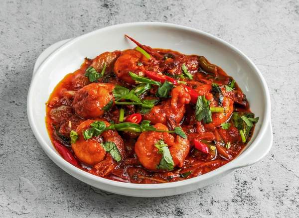 Code di gamberi preparate in salsa vindalu (agrodolce) cipolle e peperoni