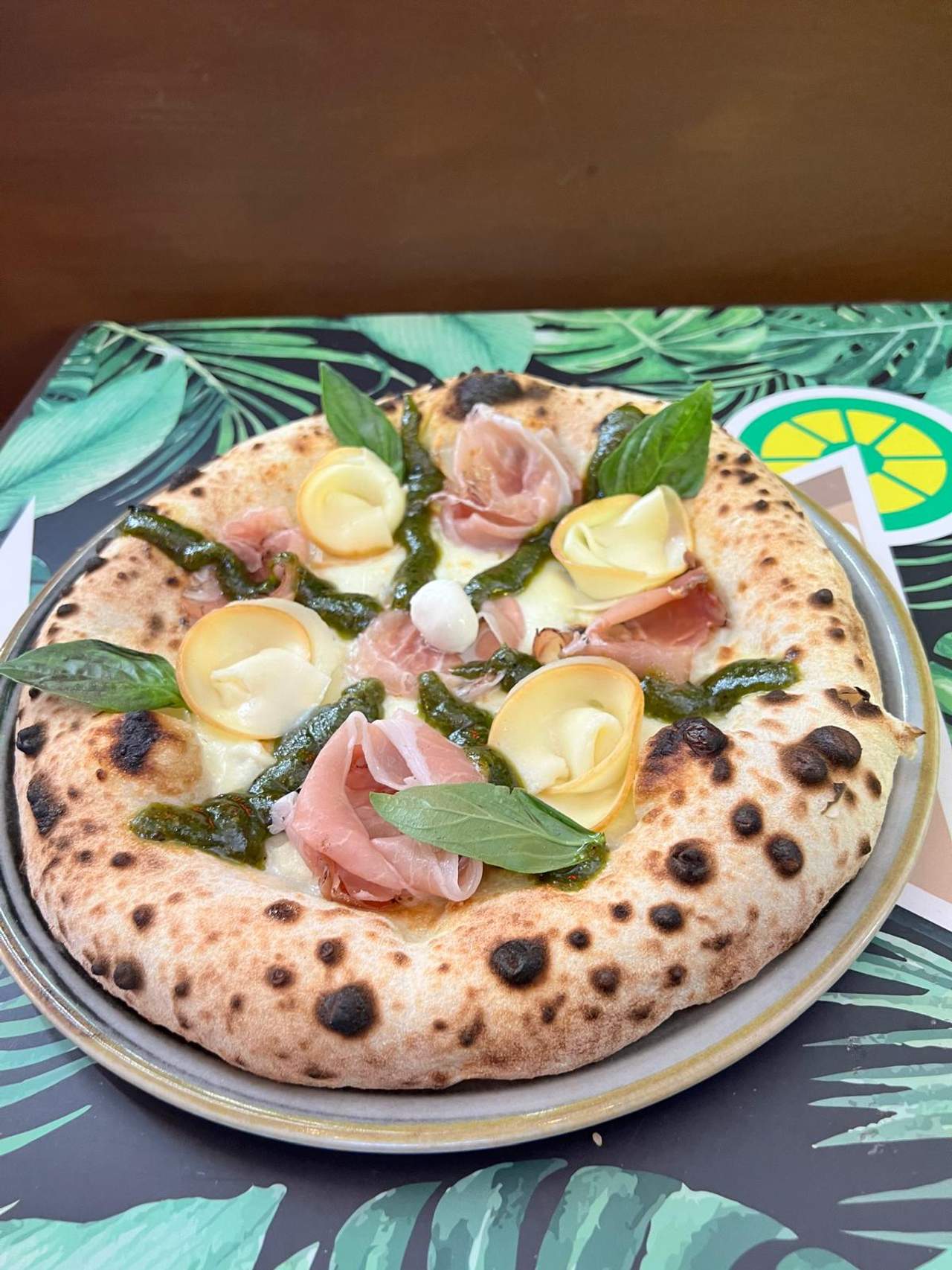 Pomodoro, fior di latte, scamorza affumicata, speck, salsiccia, crema di pistacchio e noci
