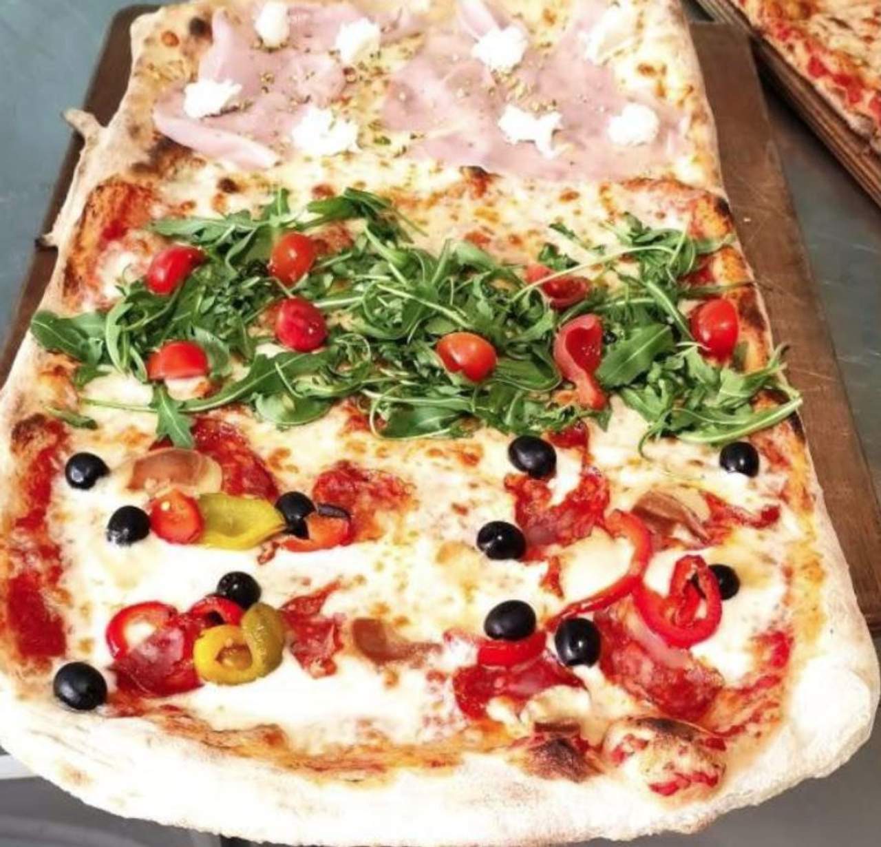 Pomodoro, mozzarella, prosciutto cotto, funghi, carciofi e olive