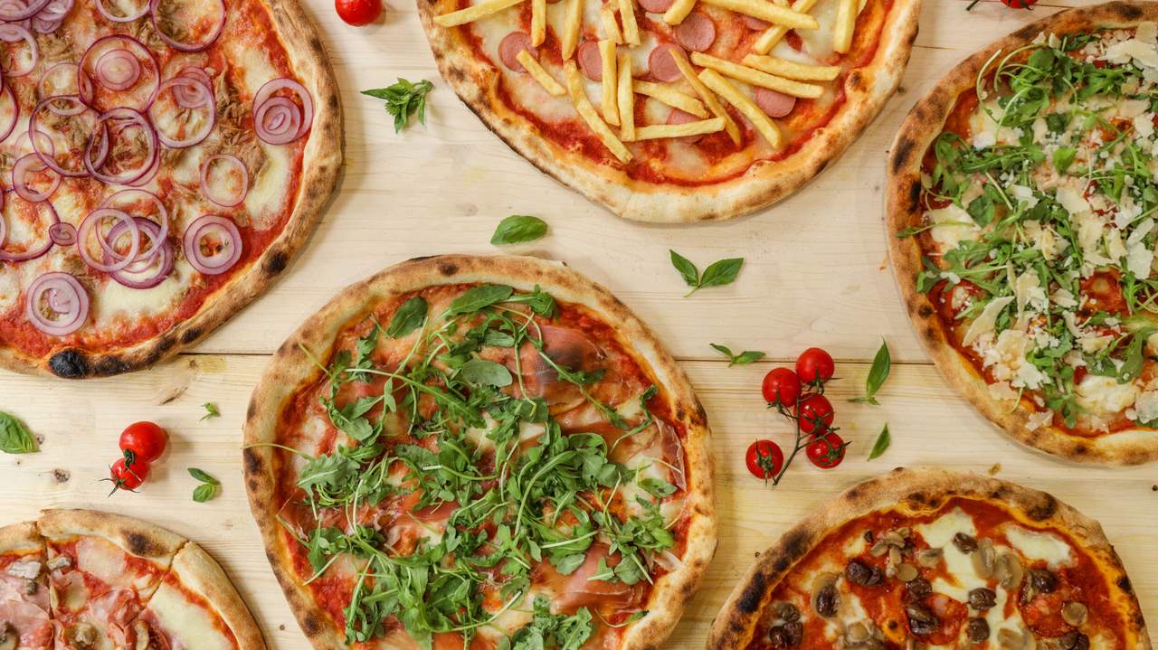 Pomodoro, mozzarella, prosciutto cotto, funghi, carciofi, salsiccia, olive, würstel, cipolla, capperi