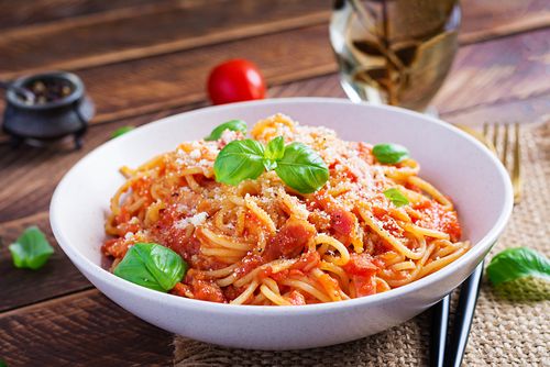 Spaghetti di semola di grano duro, cipolla, carne, carote, sedano, vino rosso Alloro, olio EVO della Costiera