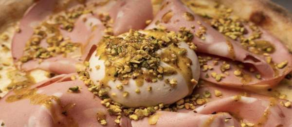 Pizza bianca con fior di latte, mortadella, pesto di pistacchio, burrata