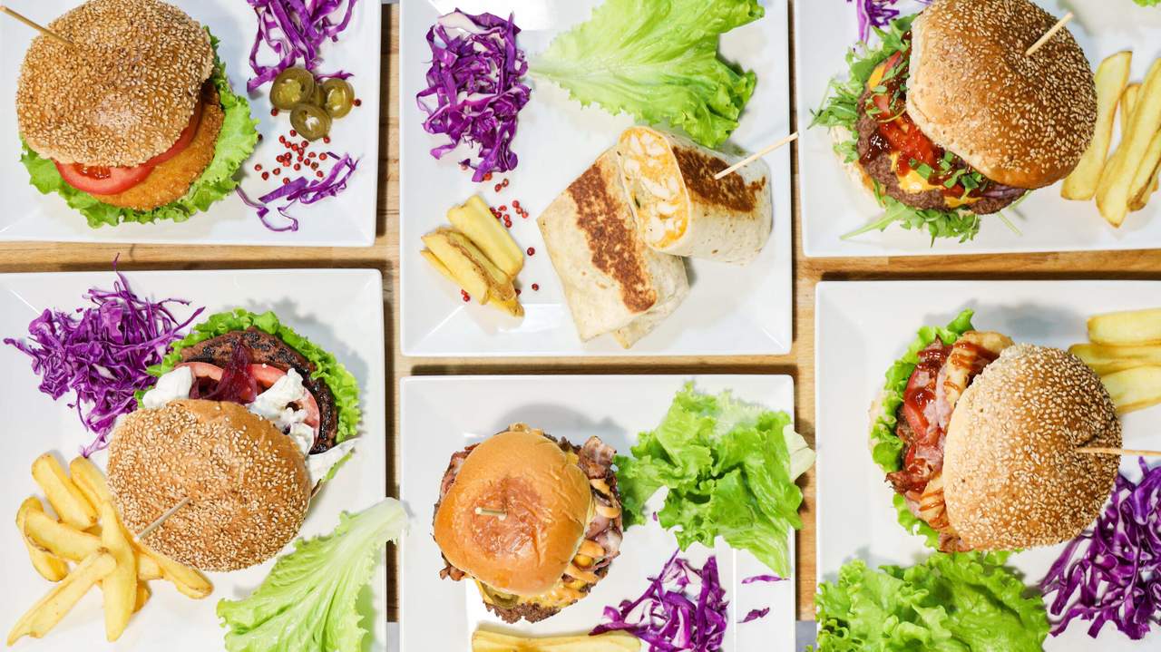 Panino di Veg burger, insalata, pomodori, cipolla caramellata, mozzarella di bufala.