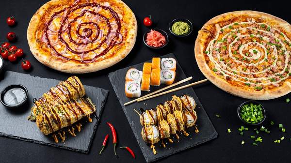 - Фил-ия, Кал-ия, Овощная (по 8 шт.) - Зап. Яки, Терияки (по 10 шт.) - Тем. Кал-ия, Курица, 4 сыра, Сакура (по 10 шт.) - Спайс Краб, Бонито (по 8 шт.) - Пепперони, Маргарита (30 см.) - Coca-Cola (2 л.)