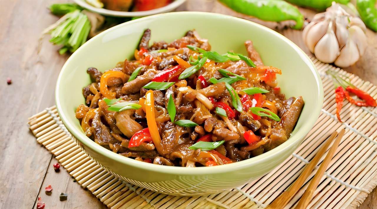 Говядина, бассай, перец полугоркий, лук, яйцо,грибы чёрный