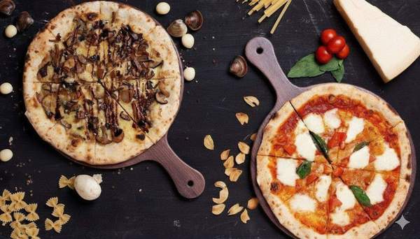 Тесто, томатный соус, сыр, колбаса, говяжий фарш, грибы