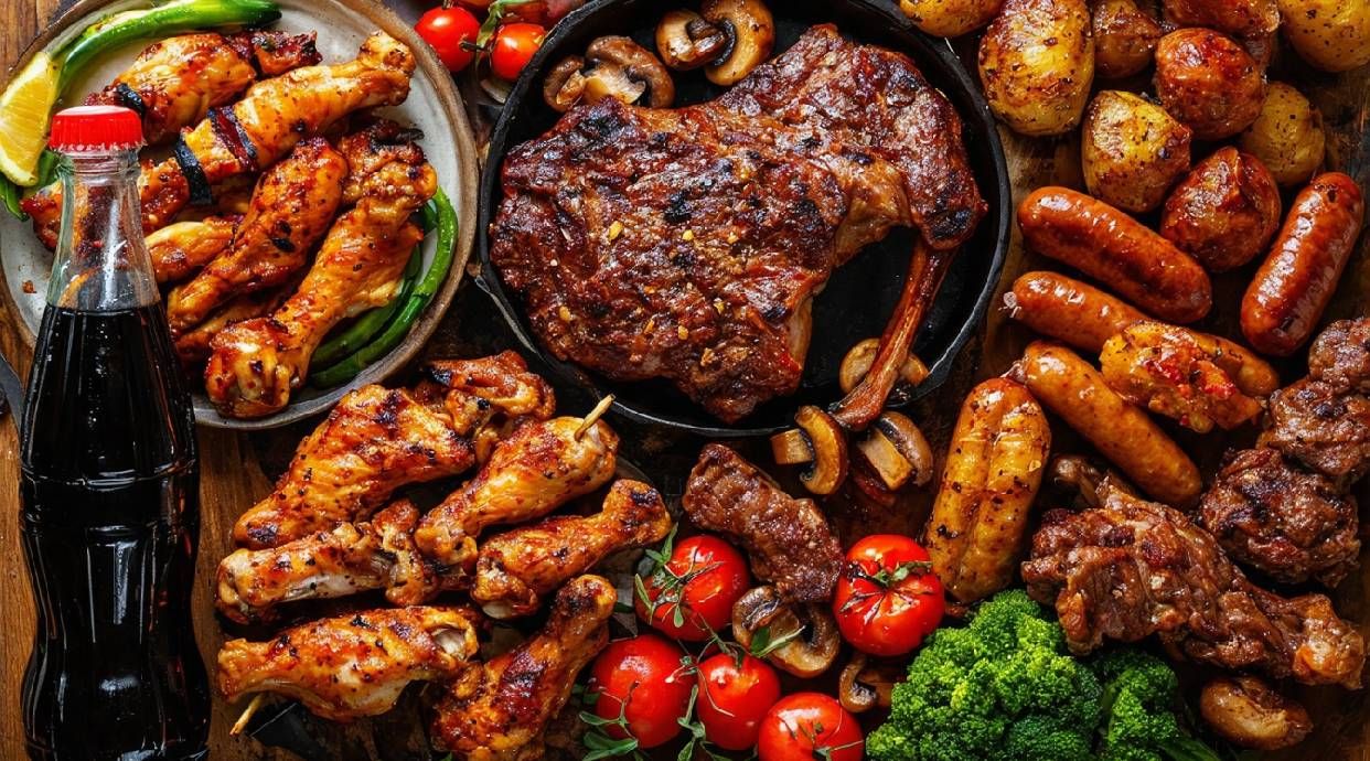 По 1 порции - (антрекот, спинка, ребрышки, баранина, люля в оболочке, печень, утка, сердце, грибы, овощи, окорочка)