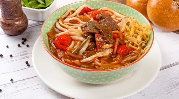 Говядина , яйцо, пекинская капуста,сельдерей,перец полугорький,лагман.