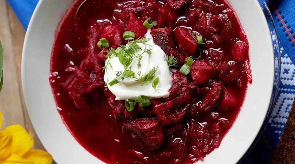говядина, свекла, картофель, лук, морковь, томатная паста
