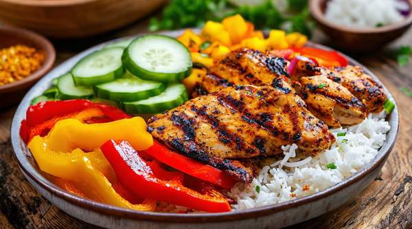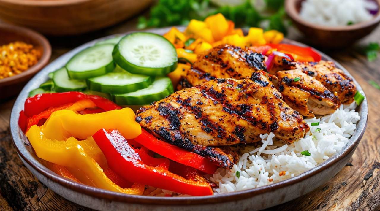 куриное филе,,болг.перец,огурцы свежие,рис,лук,специи