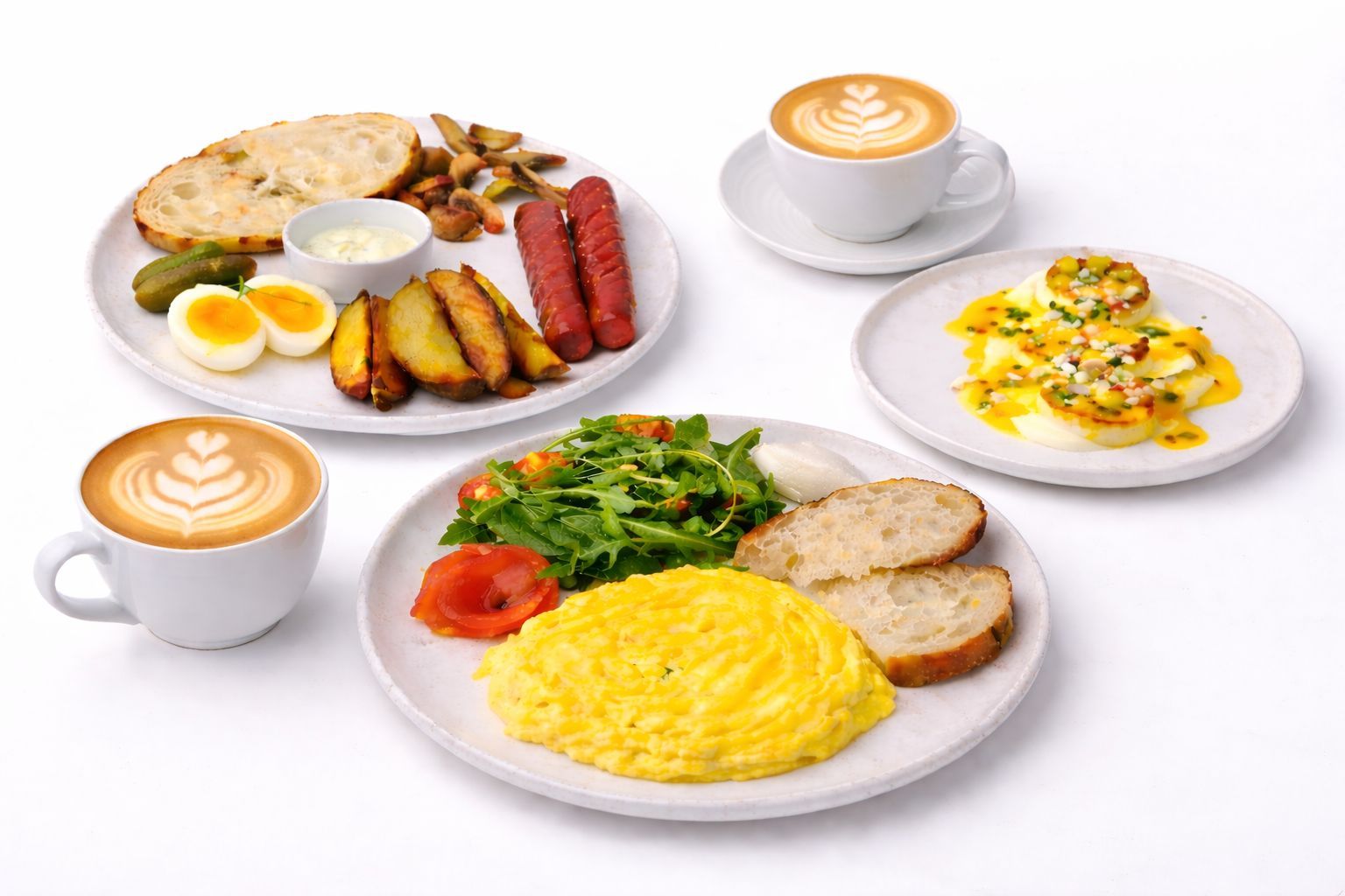 Яйцо 6 минут, картофельные дольки, колбаски, корнишоны, шампиньоны, тар-тар, тартин