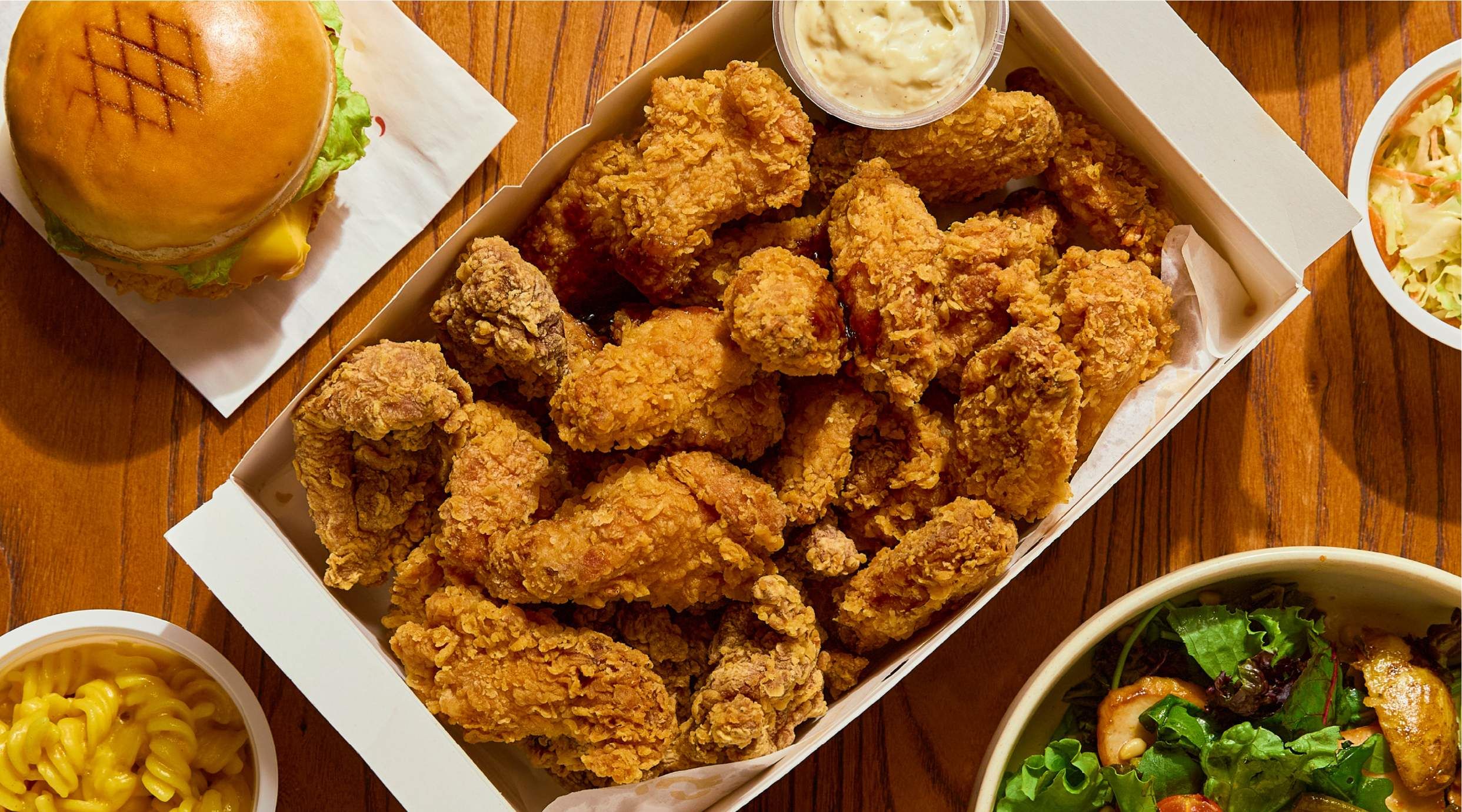 Комбо чикен бургер, комбо на выбор из 5 крыльев, 4 тендерса и 12 байтса, хрустящая картошка фри и 2 напитка. Идеальный выбор для вкусного перекуса вместе!