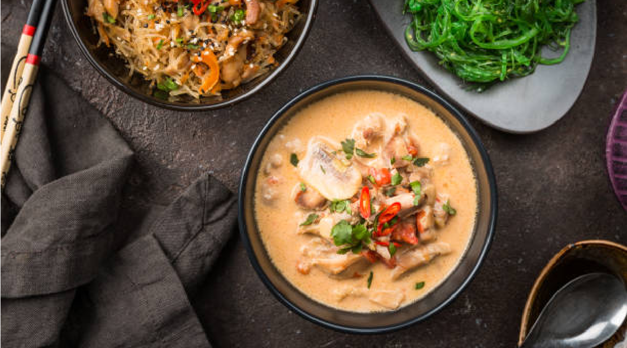 Том ям в суп добавляются морепродукты грудки, грибы, лапша, лук и другие тайские специи