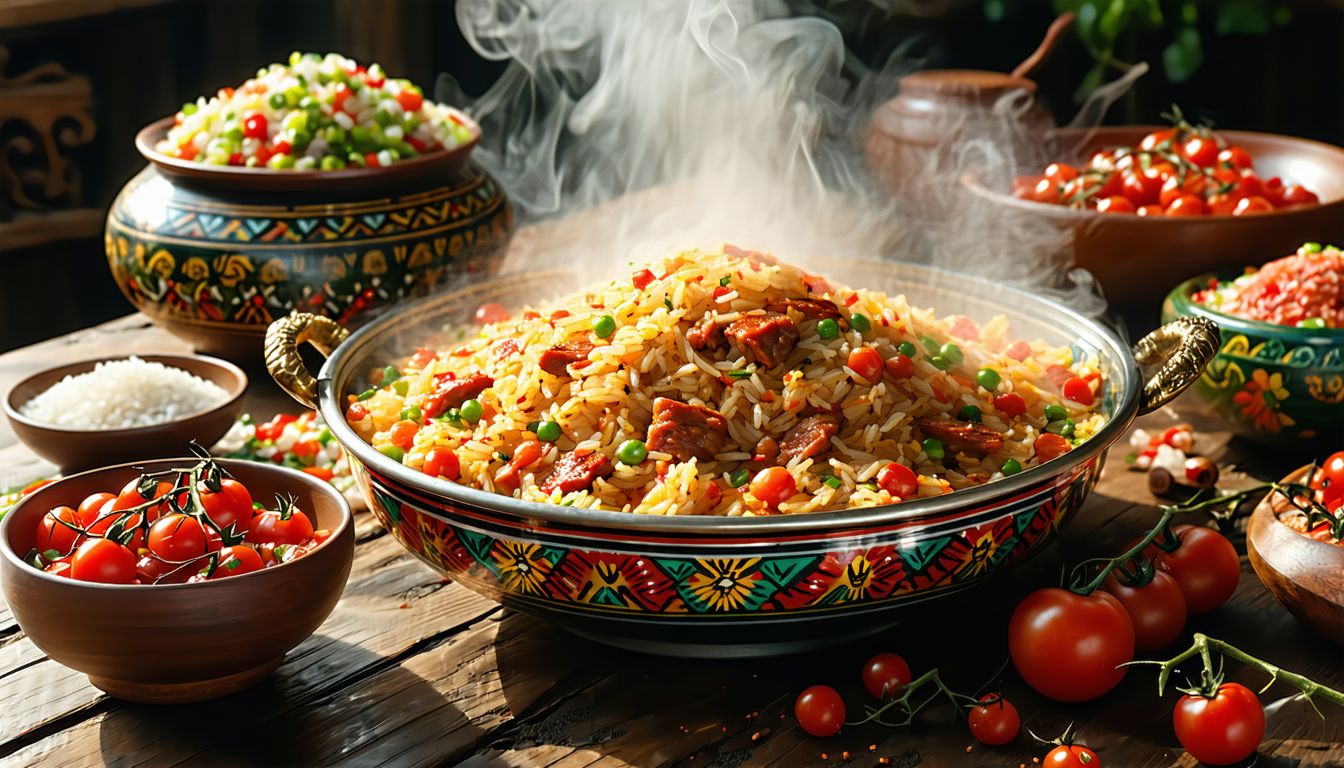 рис, мясо говядины, картофель, морковь, лук, помидоры, зелень, специи