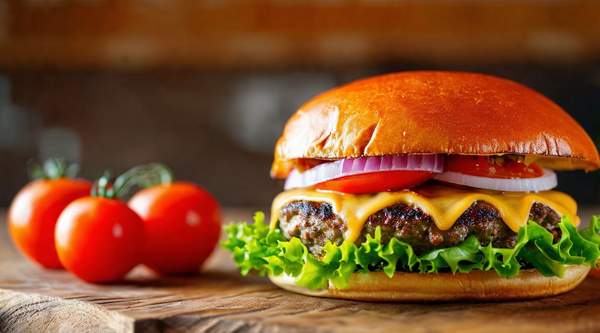 Pain, viande hachée, tomate, oignon, laitue, sauce, frites