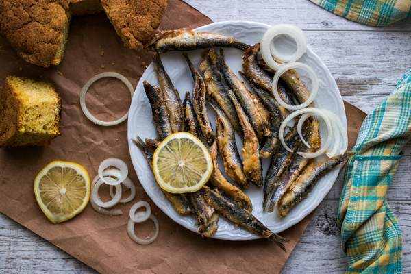 Girice pržene u dubokom ulju, prženi krompirići, kriška limuna i tartar sos