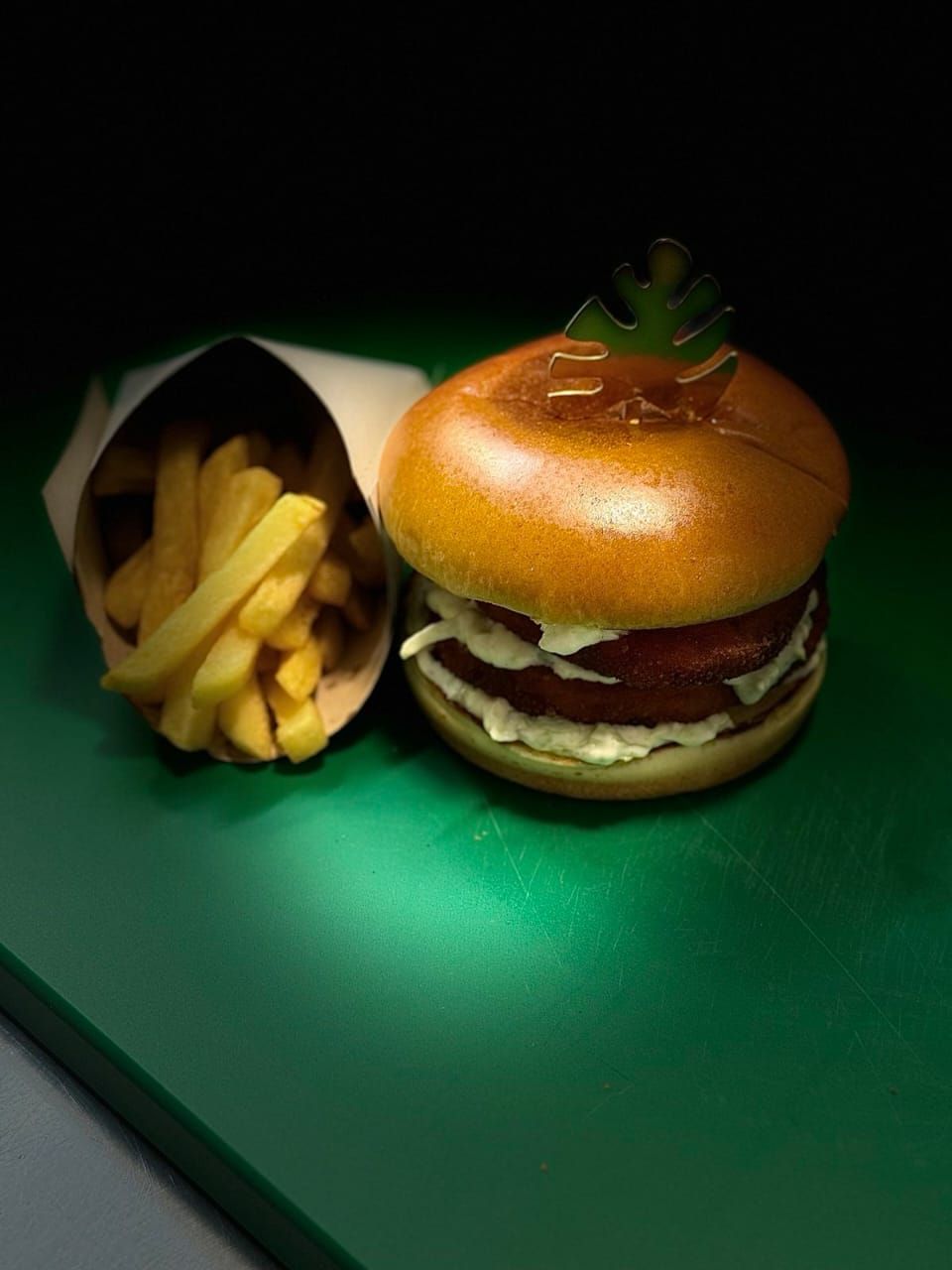 Pohovani pileći burger, brijos, majonez, kiseli krastavac, iceberg salata, pomfrit