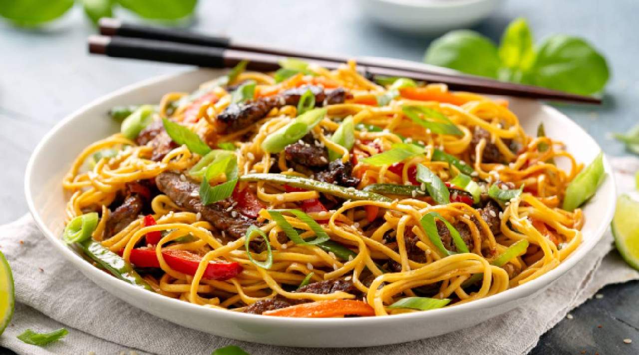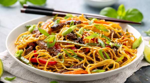 spaghetti made with vegetable chicken and spicy tomato spicy sauce